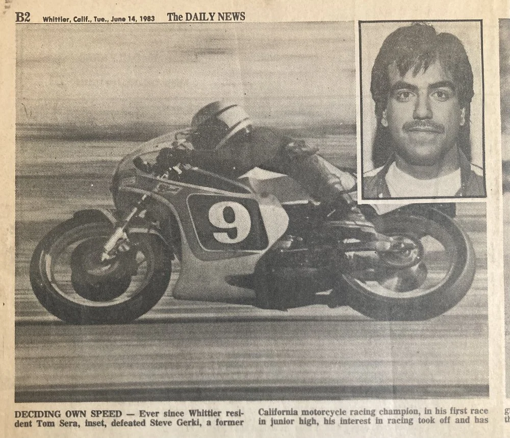 Wednesday March 31, 1982 - Whittier Daily News - “Former Whittier High School Student Tom Sera will be one of 25 riders in the special 250cc Motorcycle race preceding the formula one cars sunday at the long beach Grand Prix. The field will include many southern californians who will be piloting bikes that can top 155 mph. In addition to get fast lap, the riders will use their legs as “rudders” actually touching the pavement to maintain a point if balance. The Winner will Earn $1,250 of the $5,000 prize money.”