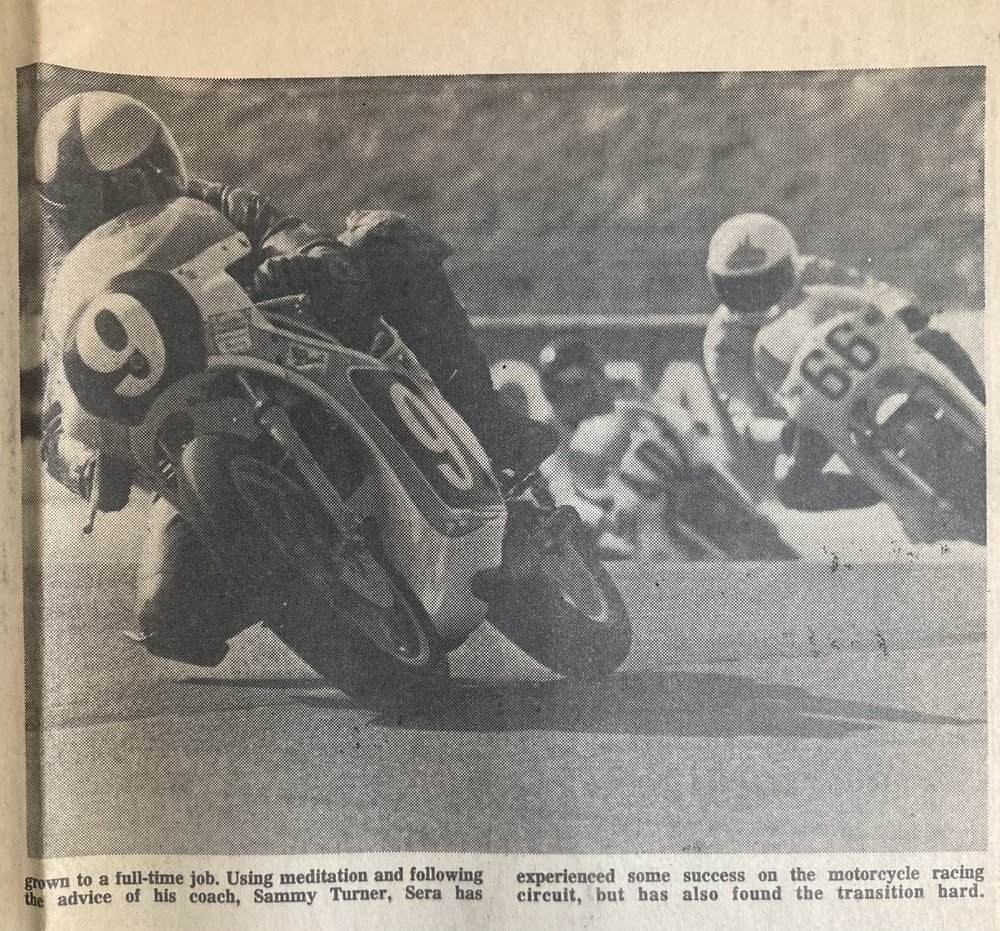 Until sera wins more races meaning purse money, he’ll be dependent on his on the names he wears on his riding leathers. he’s not complaining though just riding as fast as he can. “ - Whittier Daily News June 14 1983